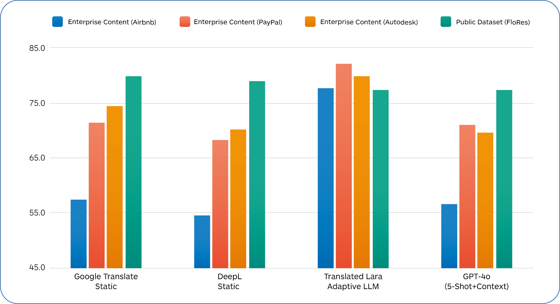 • LLMs suffer from high latency, making them less suitable for high-volume and real-time production translation workflows. However, latency can be significantly improved by tuning an LLM specifically for a translation task.