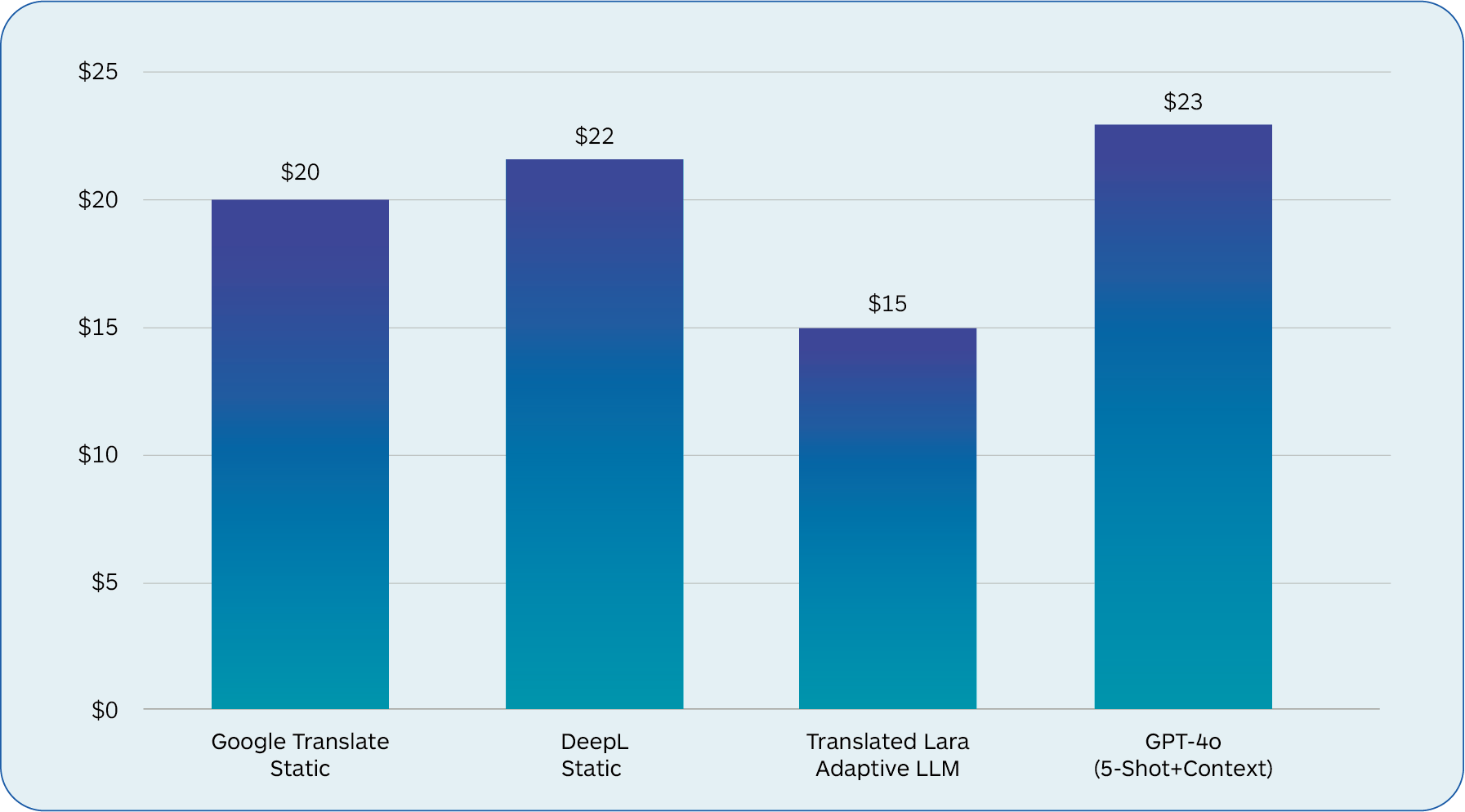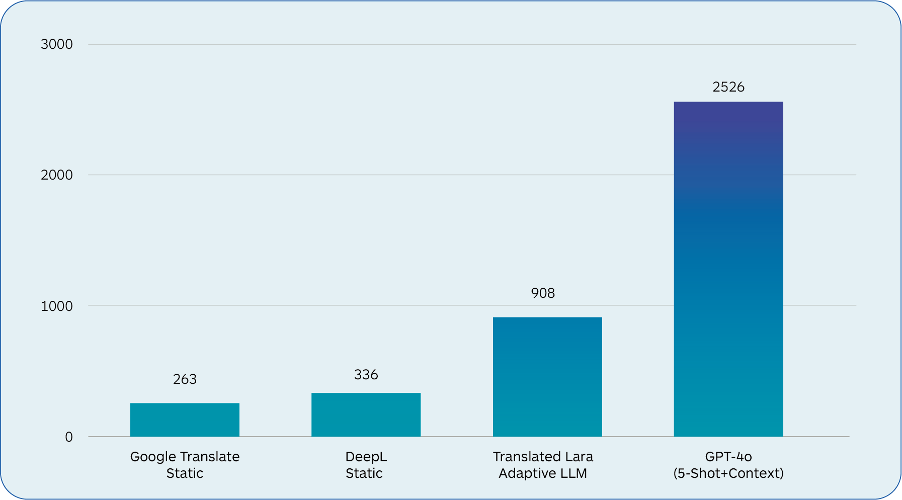 LLMs like GPT-4o have higher costs and latency compared to traditional NMT models. A custom LLM fine-tuned for a translation task, powered by expert-trained prompts, and provided with translation memories and source context, such as Translated’s Lara, performs best in cost, quality, and latency. It will generate cost savings in production enterprise settings as it will require less human oversight and corrective efforts.