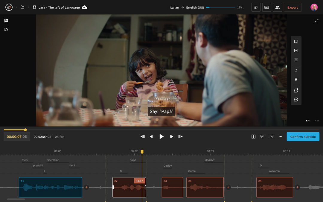 Translated is excited to announce the release of Matesub, an innovative web-based and AI-powered subtitling tool developed to help subtitlers and companies craft higher quality subtitles in less time. With Matesub, state-of-the-art AI takes care of the most time-consuming tasks involved in the subtitling process, such as positioning text and checking compliance with the provided guidelines, allowing linguists to focus on the creative part of the job. The system auto-detects shot changes and allows users to edit subtitles and position them with frame-level precision. These features are combined with a powerful WYSIWYG editor that shows subtitles exactly as they will be displayed in the final video.